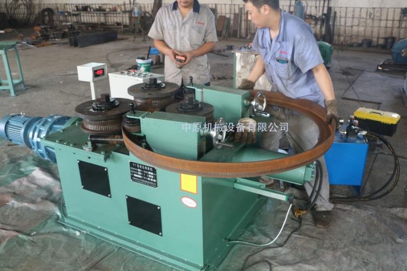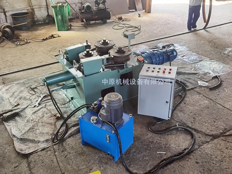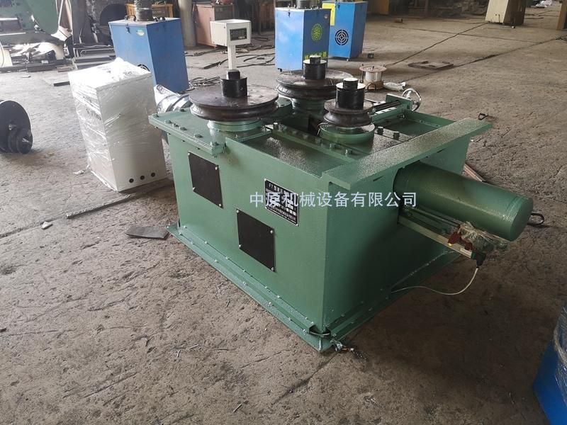 該機為叁輥型材卷圓機,集機電一體。電機輸出的較高轉(zhuǎn)速通過傳動裝置(聯(lián)軸器,減速機,齒輪等)轉(zhuǎn)換成所需的大扭矩低轉(zhuǎn)速,帶動固定位置的兩主動輥實現(xiàn)旋轉(zhuǎn)運動,為型材行走提供扭矩。被動輥通過油缸前進(jìn)、后退實現(xiàn)位移,來控制直徑大小。三個工作輥成等腰三角形分布,通過調(diào)整移動輥實現(xiàn)這三個點形成的弧線達(dá)到所需彎曲半徑,借助被動輥的壓緊及兩主動輥的旋轉(zhuǎn)運動,使型材經(jīng)過多次連續(xù)彎曲,產(chǎn)生永久性塑性變形,用于常溫狀態(tài)下將型材卷制成圓形,弧形等工件。