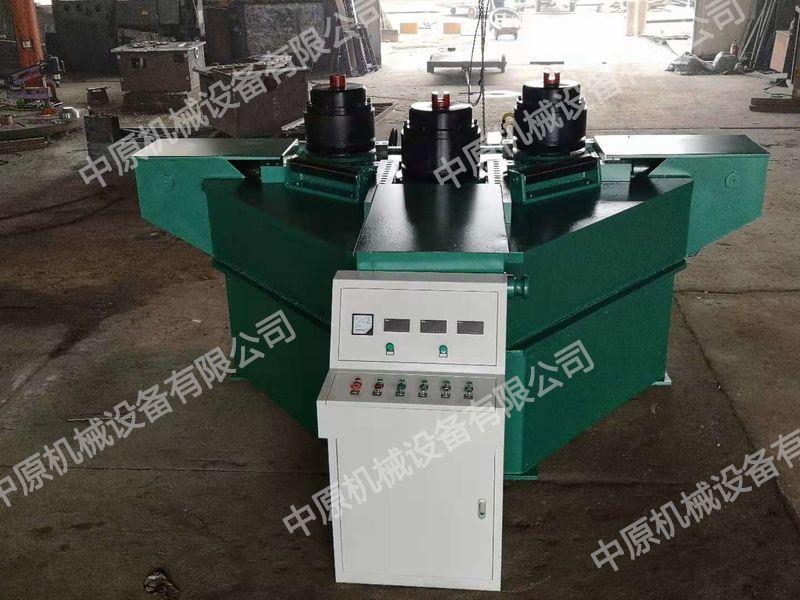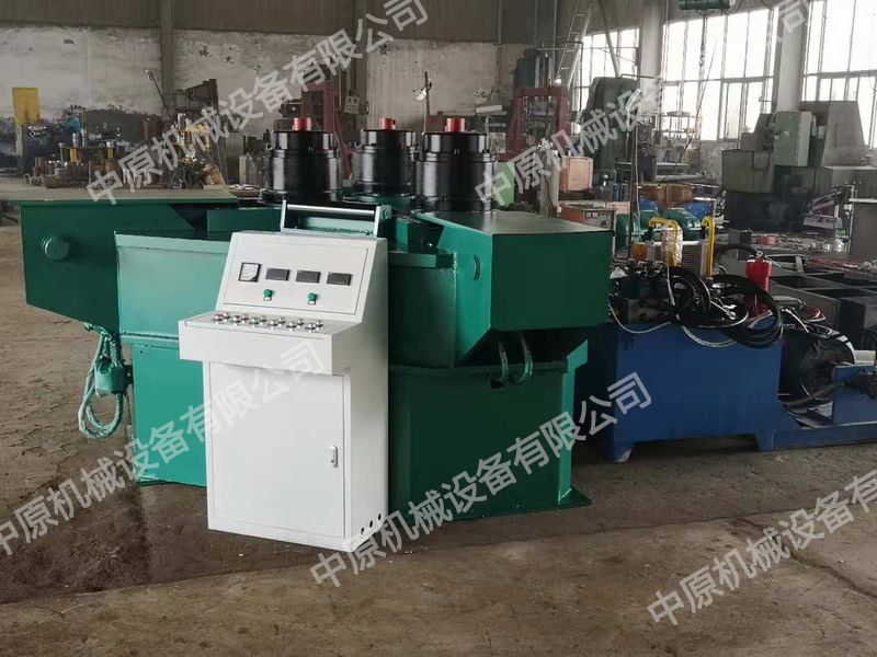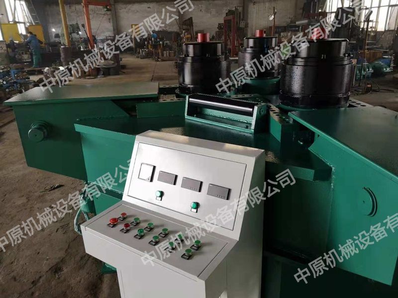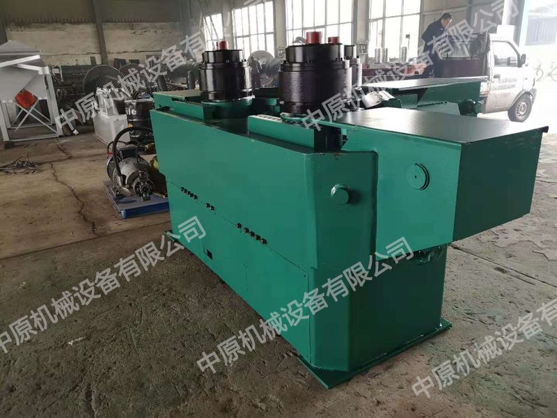 該機(jī)為叁輥型材卷圓機(jī),集機(jī)電一體。電機(jī)輸出的較高轉(zhuǎn)速通過傳動(dòng)裝置(聯(lián)軸器,液壓馬達(dá),液壓油缸,齒輪等)轉(zhuǎn)換成所需的大扭矩低轉(zhuǎn)速,帶動(dòng)兩主動(dòng)輥實(shí)現(xiàn)旋轉(zhuǎn)運(yùn)動(dòng),為型材行走提供扭矩。兩個(gè)主動(dòng)輥中心距可調(diào),被動(dòng)輥通過液壓油缸前進(jìn)、后退實(shí)現(xiàn)位移,來控制直徑大小。三個(gè)工作輥成等腰三角形分布,通過調(diào)整移動(dòng)輥實(shí)現(xiàn)這三個(gè)點(diǎn)形成的弧線達(dá)到所需彎曲半徑,借助被動(dòng)輥的壓緊及兩主動(dòng)輥的旋轉(zhuǎn)運(yùn)動(dòng),使型材經(jīng)過多次連續(xù)彎曲,產(chǎn)生永久性塑性變形,用于常溫狀態(tài)下將型材卷制成圓形,弧形等工件。